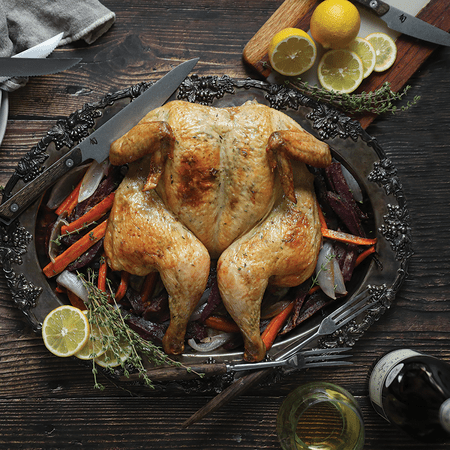 Spachkock the chicken. Cut along both sides of the backbone to remove it. Once removed, place the chicken breast-side up on a parchment-lined baking sheet. Press down on the breasts to break the breastbone allowing them to lay flat.