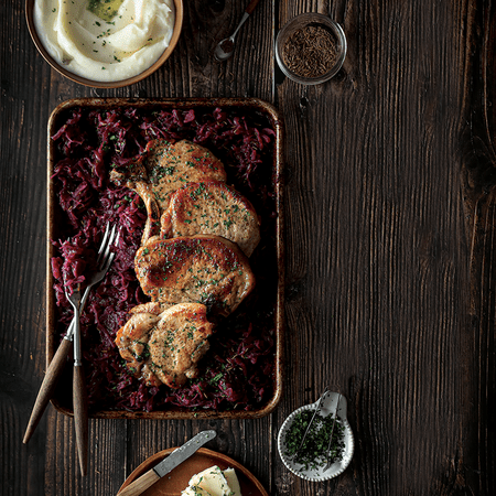 In a medium bowl, combine the remaining ingredients, and distribute evenly on the baking sheet, mixing it into the juices on the pan as you spread it out. Cover with foil and braise for 30 to 40 minutes, or until tender. Place the pork chops on top of the braised cabbage, garnish with fresh chopped parsley, and serve warm with mashed potatoes.