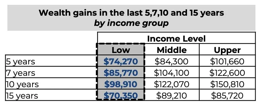 Owners who live in pricey metro areas have seen some of the largest wealth gains over the last decade, according to NAR’s report. For example, in the San Jose metro area, low-income earners have accumulated nearly $630,000 over the last 10 years while middle-income earners gained $643,000. All of the top 10 areas with the largest wealth gains for low-income owners—with equity surpassing $290,000—were located in California.