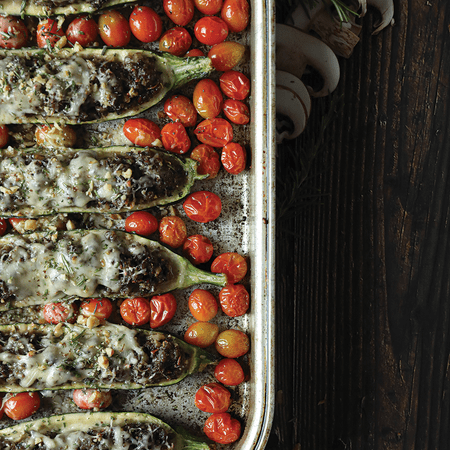 Pour the tomatoes onto a sheet pan. Toss or brush the tomatoes in the remaining oil to coat. Place the zucchini on the sheet pan with the tomatoes, skin-side down, and season both with salt.